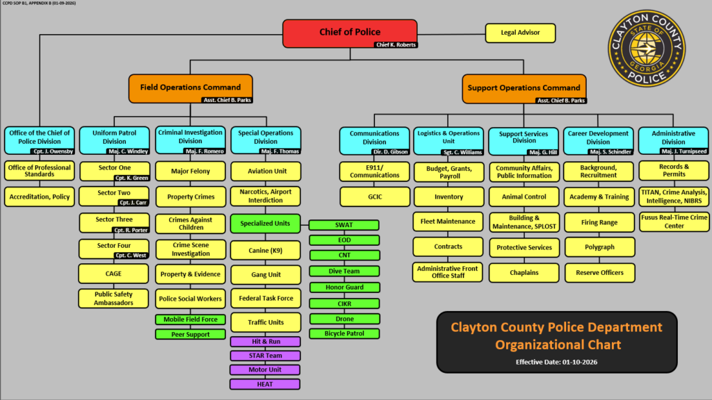 Organization Home > Organization OrganizationField Operations CommandCriminal Investigation DivisionCSI Human Services Investigations Property & Evidence Special Operations DivisionAviation Traffic Uniform Patrol DivisionK-9 Unit Patrol Sectors Office of the Chief of Police Division Support Operations CommandAdministrative Division Career Development DivisionBackground and Recruiting Police Academy Communications DivisionE911 E911 Employment Logistics & Operations Division Support Services DivisionAnimal Control Chaplains Community Affairs Protective Services Unit Field Operations CommandUniform Patrol DivisionPatrol Sectors K-9 Unit Criminal Investigation DivisionCSI Investigations Property & Evidence Human Services Special Operations DivisionTraffic Aviation Office of the Chief of Police Division Support Operations CommandSupport Services DivisionAnimal Control Community Affairs Protective Services Unit Chaplains Communications DivisionE911 E911 Employment Logistics & Operations Division Career Development DivisionBackground and Recruiting Police Academy Administrative Division